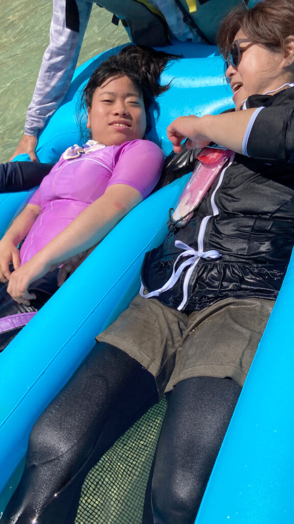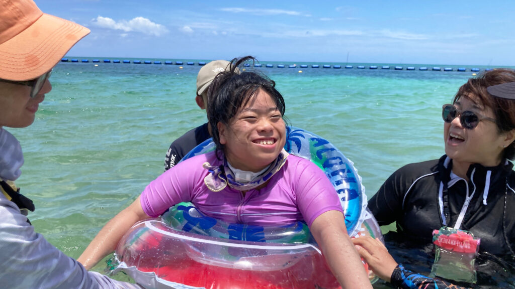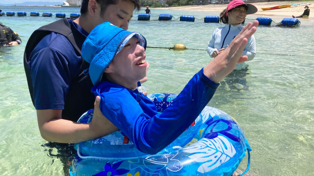 ツアーでは障がいがあっても安全な遊泳方法を紹介しており、既にツアー参加経験のあるご家族が不安なく実践している様子を見ることもできました。
