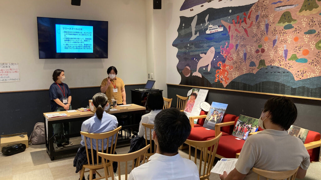 写真をスタッフが説明するほか、トークタイムという時間を作ってフリースクールの紹介や質疑応答などを行いました。