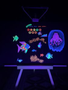 私たちが提供している2つの体験はどちらも暗い部屋の中で実施し、ブラックライトを当てることで光るパネルやグッズを使用します。