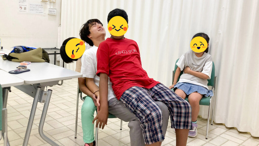 自由時間中に子どもたちにもみくちゃにされる中間さん。