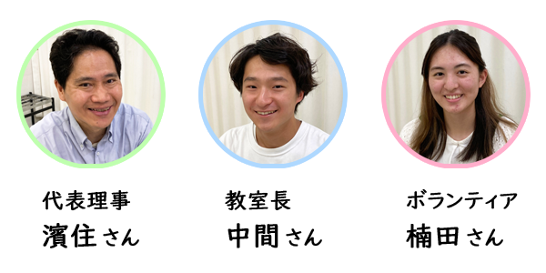 今回お話しくださったのは、代表理事の濱住 邦彦さん、金曜クラス教室長の中間 陽太さん、ボランティアの楠田 薫さんの3名です。