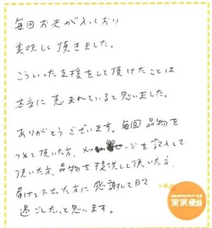 まずは、児童養護施設の職員の方からのお手紙。施設では毎日顔を合わせて生活していたのに、施設を離れるとなかなか顔を合わせる機会がありません。実家便を通して、「あなたを気にしていますよ。何かあったら連絡して欲しい」と伝えるきっかけにしています。初めて受け取る職員からの手紙。忙しい職員が自分に手紙を書いてくれる。お互い照れ臭いこともあるでしょうが、「手紙が嬉しかった」と子どもに言われて、「職員自身の励みにもなっています。」との職員からの報告もあります。