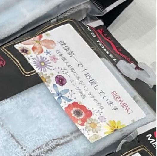 更に、協力企業のボランティアの方の応援メッセージも同封されます。ギフトのハンカチタオルも、応援メッセージ付きです。