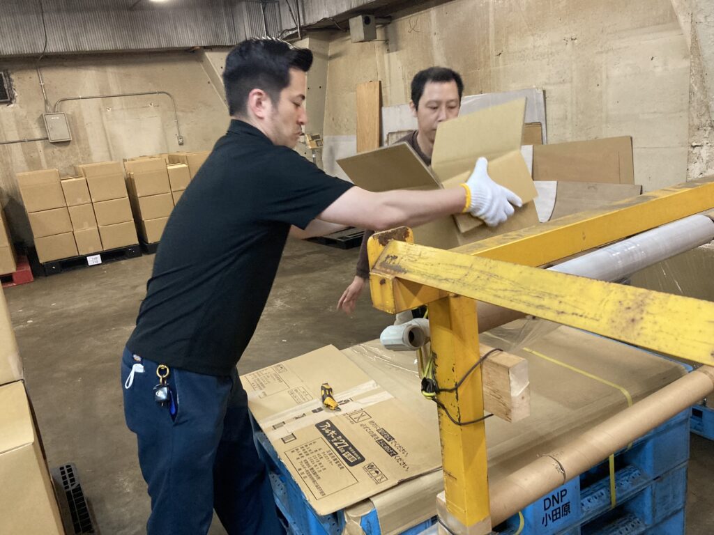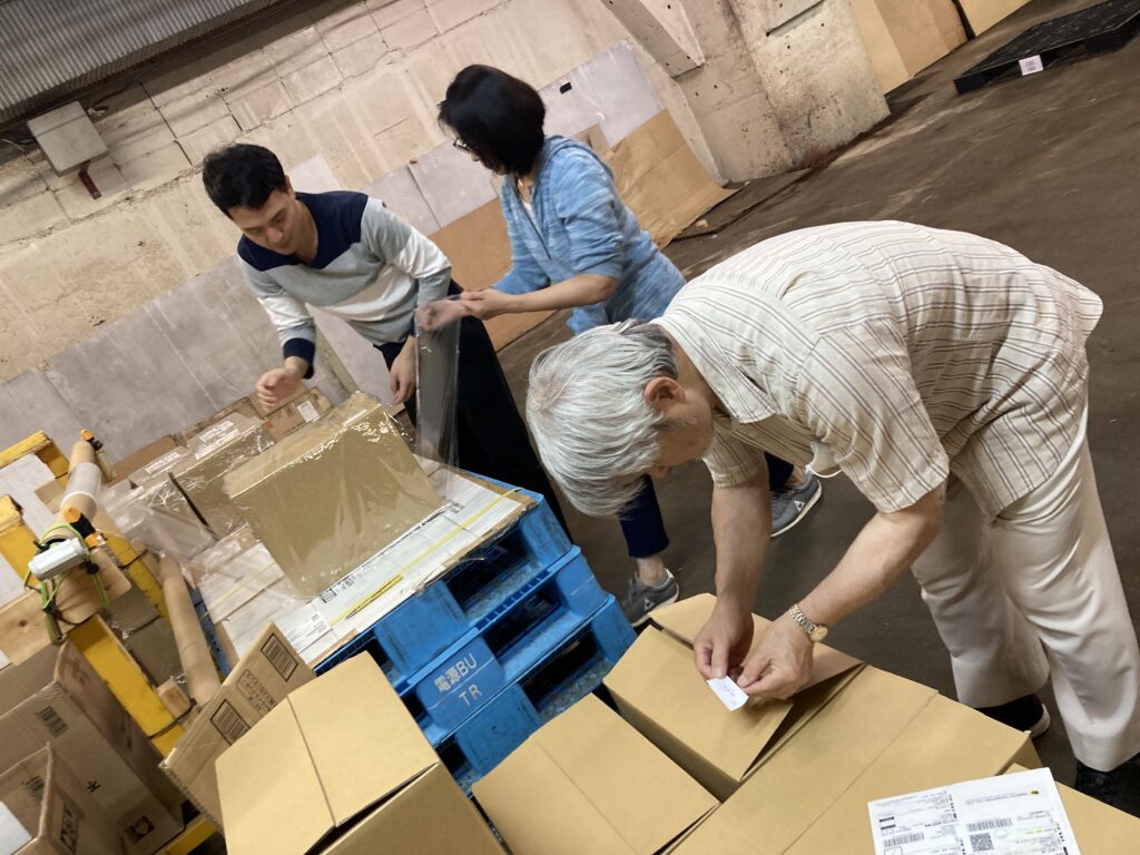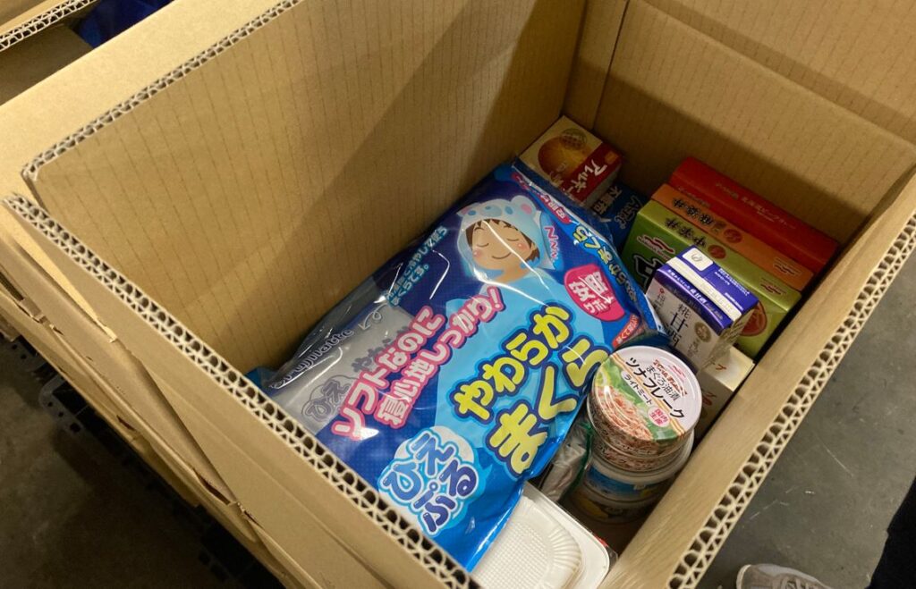 「実家便」を発送する株式会社ニッパック物流さんに委託し、食料品等の内容物は箱の中に詰めた状態まで完了しているので、主な作業はお手紙などの個人情報が入った封筒の同封、梱包と宛名ラベル貼りです。