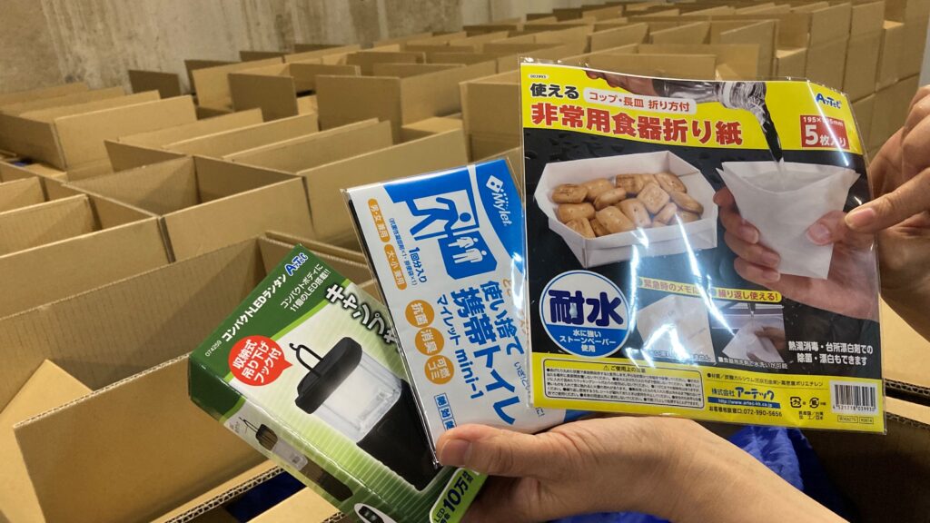 1回目の「実家便」の中には、食料品以外にホイッスルや携帯トイレ、ランタン等の災害時に役立つ防災用品を入れます。