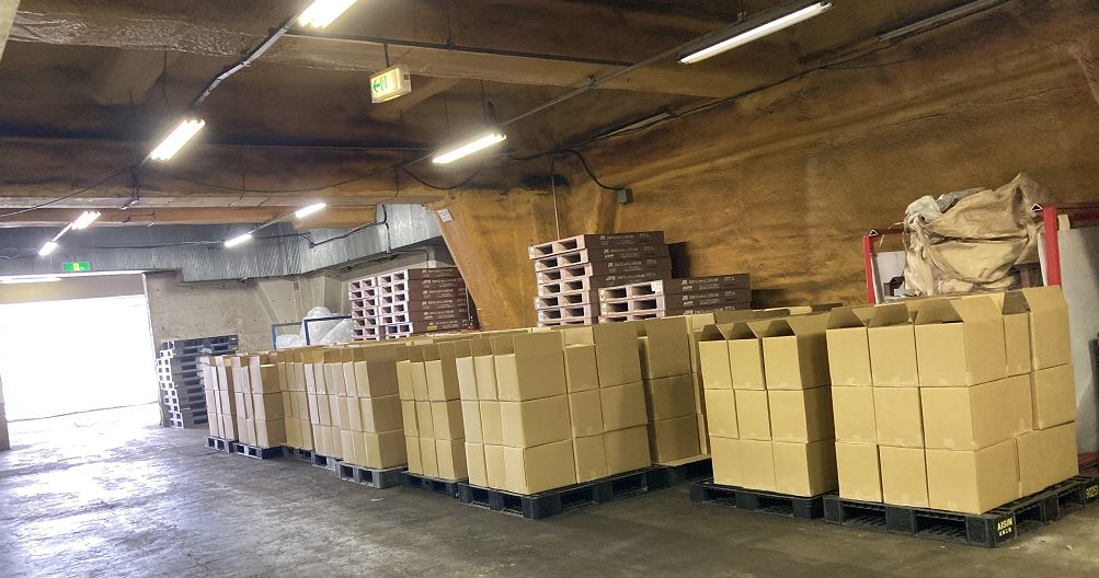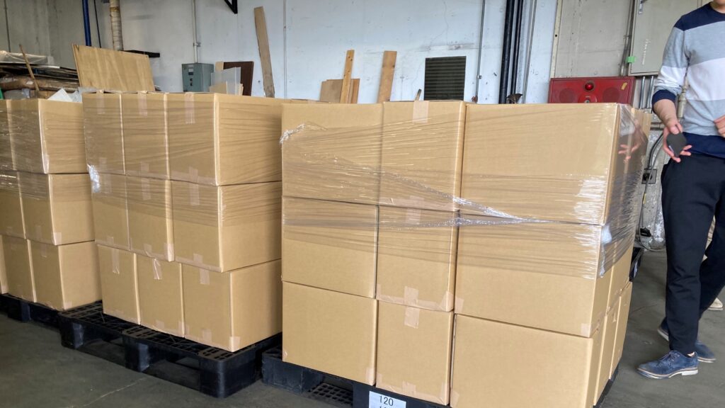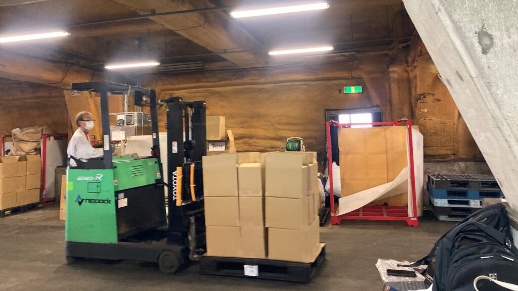 梱包し宛名ラベルを貼り終わった「実家便」は30箱程まとまるとフォークリフトで移動。一息つく間もなく未梱包の「実家便」が次々と運ばれてきます。