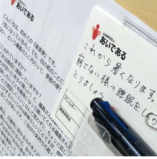 あいである事務局のお手紙とボランティアの方の応援メッセージカード