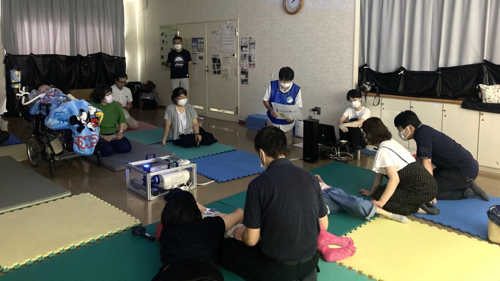 会場として使われた多目的ホールは、普段は机と椅子がならぶ一般的な会議室ですが、部屋の机や椅子を端によけ、柔らかいマットが敷かれています。今回参加された3組の障がいのあるお子さんとそのご家族の皆さんは、不思議な雰囲気に若干戸惑いつつ、スタートを待ちます。