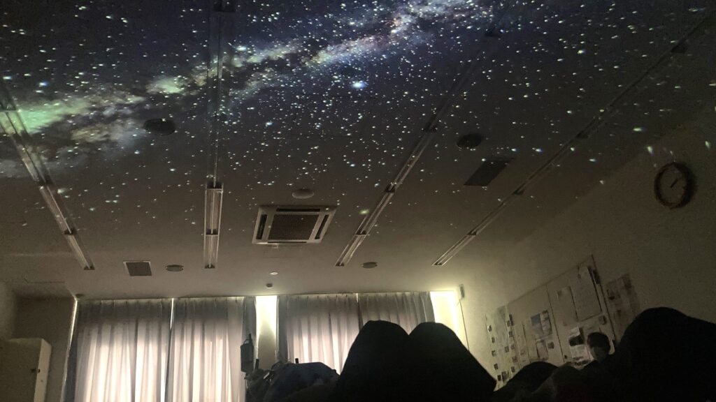 時間になり、共同代表の跡部さんから星つむぎの村の説明の後、いよいよプラネタリウムがスタート。参加した皆さんは、ゴロンと寝ころび天井を見上げます。同じく共同代表の高橋さんが語り始め、部屋の電気が消えプロジェクターが投影されると・・・天井には、美しい星空が広がりました。