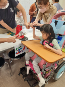 自分の顔写真を缶バッチの部品に重ねて機械でガッチャンとするだけでオリジナル缶バッチが出来上がりました。みんな車いすに付けてくれています。