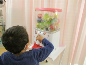 「今回の入院では「ガチャガチャしたいから頑張る!」とガチャガチャを励みに検査や治療を頑張ることができました。出てきた景品のおもちゃを嬉しそうに家族や先生に見せて回っていました。」という内容でした。