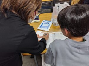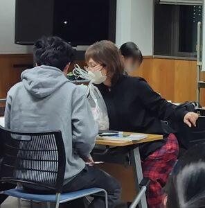 津田さんと一緒に駅までお迎えに来てくれた「りりかちゃん」が、中学生たちを前に数学と英語を教えています。