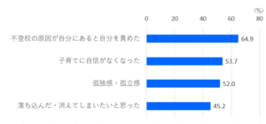 経済的な面だけではなく、64.9%の親が「不登校の原因が自分にあると自分を責めた」と回答し、52.0%が「孤独感・孤立感」を感じたと回答しています。子どもが不登校となることで、親も苦しんでいることが分かります。