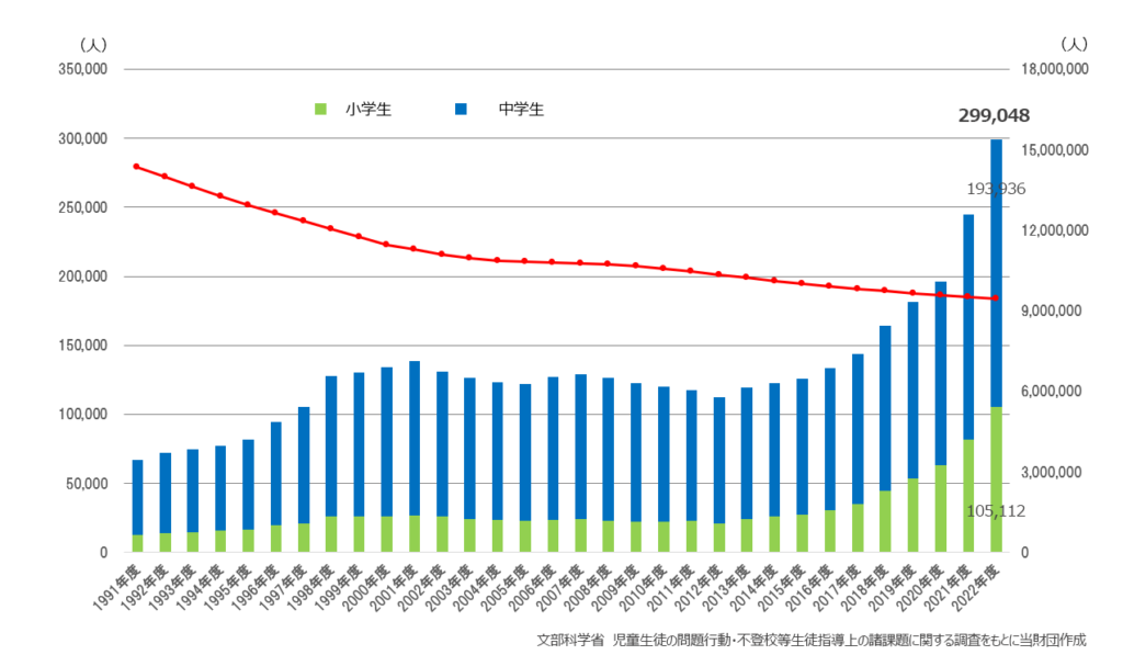 不登校は、病気や経済的事情以外の理由で1年間に学校を30日以上欠席することとされています。その数はコロナ禍中に急増し、2022年度には中学生19万3936人、小学生10万5112人に上りました。1991年からのおよそ30年間に、小中学生の数が143万人から94万人へと3分の2に減少している一方で、不登校の数は6.7万人から29.9万人へと、4倍以上に増加しています。