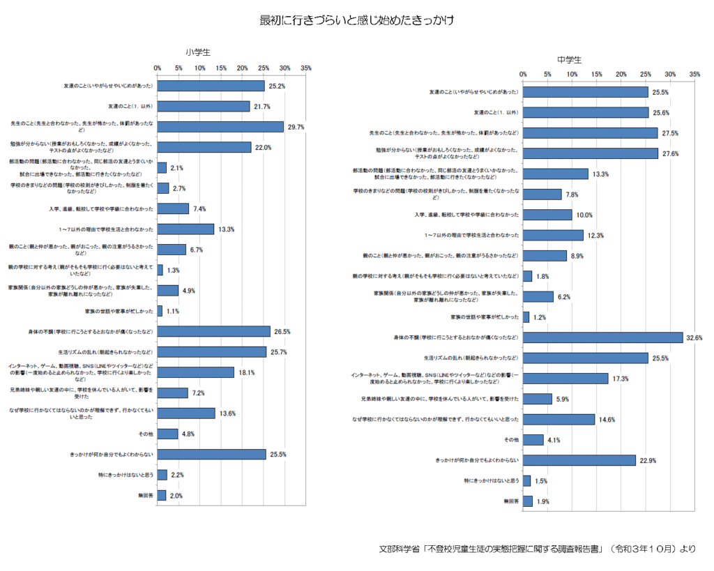 不登校の子どもたちを対象にした文科省の調査では、最初に学校に行きづらいと感じたきっかけとして、小学生・中学生ともに約25%が「友達のこと(いやがらせやいじめがあった)」と回答しています。また、小学生では29.7%、中学生でも27.5%が「先生のこと(先生と合わなかった、先生が怖かった、体罰があったなど)」と回答しています。