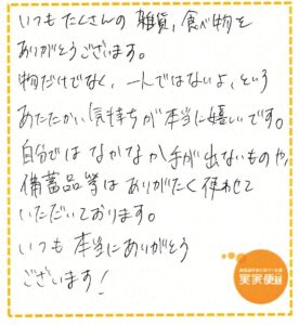 でも児童養護施設から巣立った子どもたちにはそういったことがありません。ですから「社会に放り出されてしまった」「自分には気にかけていてくれる人がいない」という孤独感・孤立感を抱えている子がとても多いのです。実家便では、食品や生活用品などのモノだけでなく、児童養護施設の職員からの手紙やボランティアからのメッセージを一緒に届けています。「あなたは独りじゃない」ということを子どもたちに伝えたいのです。