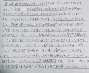 コロナ禍でバイトができなかったことや、医学部の実習が難しくなったことなど、予想もしない困難もありましたが、「多くの人から信頼される医師になりたい」という目標を掲げ、努力を重ねてきた彼を心から讃えたいと思います。そして、6年間支え続けてくださった皆さまに心から感謝申し上げます。