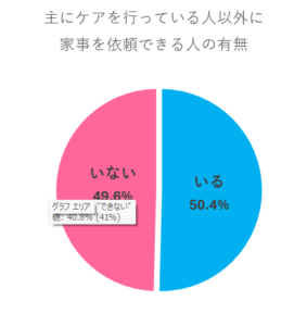 そんな中で、約半数の母親が、自分以外に家事を頼める人がいない状況です。また、自分以外に子どものケアを依頼できる人についても、1/3以上が「いない」という状況にあります。