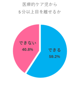 医療的ケア児を育てる親御さんへの調査では、自分の子どもから「5 分以上目を離せるか?」という質問に対し、「できない」という回答が40%を超えています。たった5分のわずかな間も目を離すこともできないくらい、張り詰めた日々を送っている様子がうかがえます。