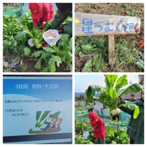 星つむぐ畑での作物栽培体験として、ジャガイモ、サトイモ、カブなどの種まき・植え付け・収穫を体験しました。