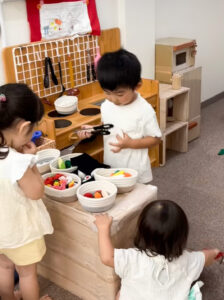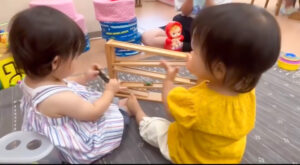 親御さん同士はスタッフと一緒にティータイムでちょっと一息、子ども同士は豊富にある木のおもちゃに囲まれて、親子共に楽しいひと時を過ごしています。