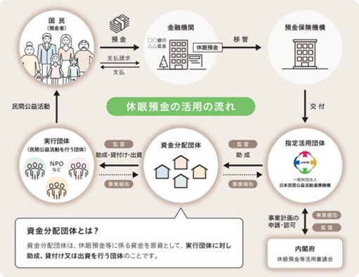 - 「休眠預金等」とは、10年以上、入出金等の「取引」がない「預金等」のことを指し、預金が「休眠預金等」となった場合、預金保険機構に移管され、最終的に「民間公益活動」の促進に活用されます。