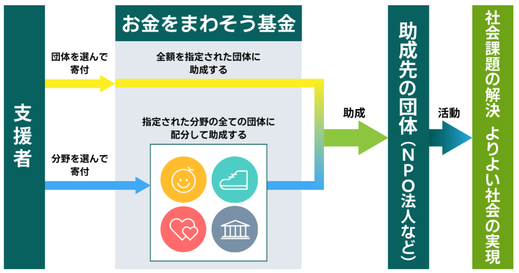 自団体を指定した寄付のほか、自分の事業が属する分野への寄付の一部も助成金として受け取ることができます。